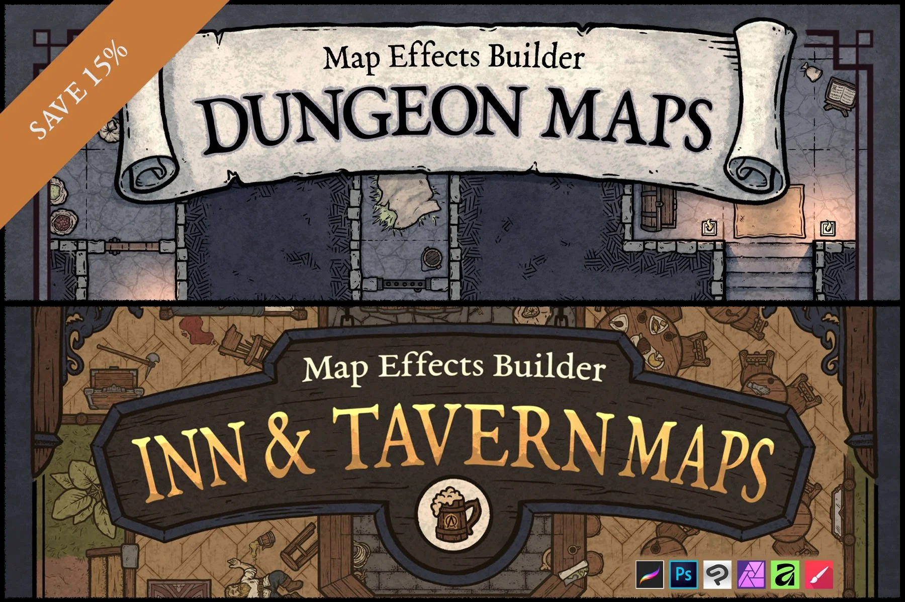 Double your RPG mapping arsenal and SAVE with the Dungeon & Inn Map Builder Bundle; seamlessly combining two interior map builders, giving you over 850 hand-illustrated features.