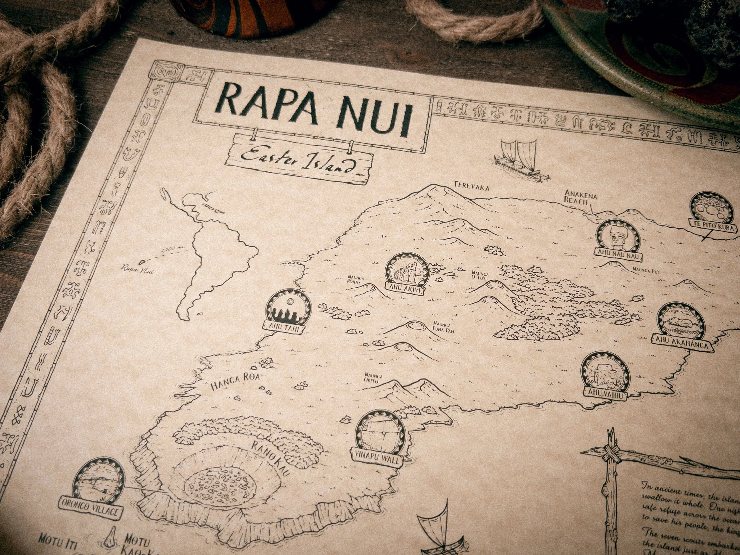 This hand-drawn map traces the world of Rapa Nui, the most remote inhabited island on earth, rising alone from the vast Pacific. According to tradition, its first settlers fled a sinking homeland, guided across the open sea until they reached this lonely shore. Here, at the edge of the world, they built a new life from volcanic rock and wind. From the quarries of Rano Raraku came the moai, monumental stone figures, their silent faces keeping watch over the people. Craters, lava fields, ceremonial platforms, and scattered statues form a landscape at once stark and sacred.