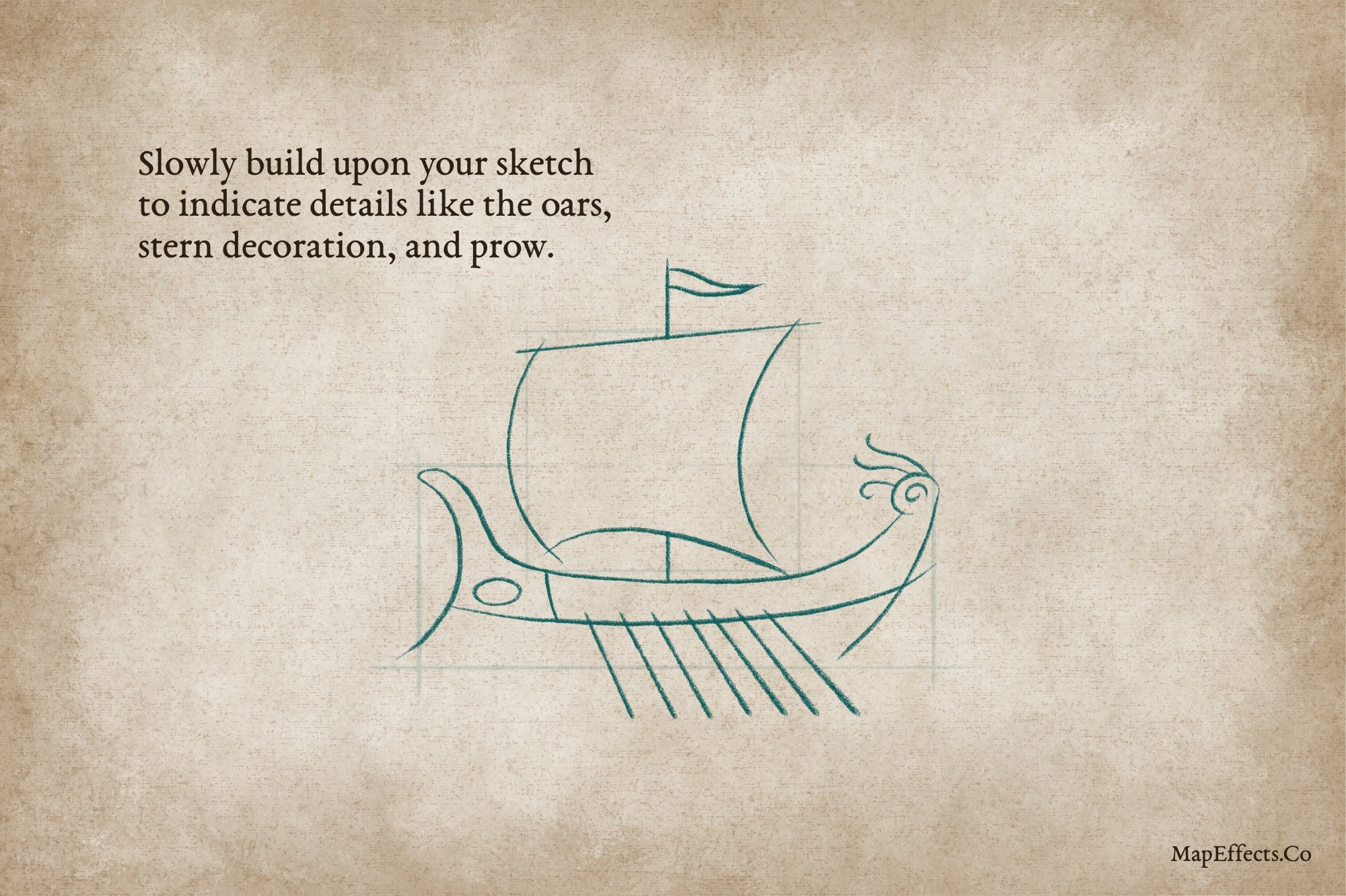 We begin with simple shapes and work toward complexity. Now you can sketch in things like oars coming out of the side of the ship, as well as the eye at the front and the tail feathers at the back.