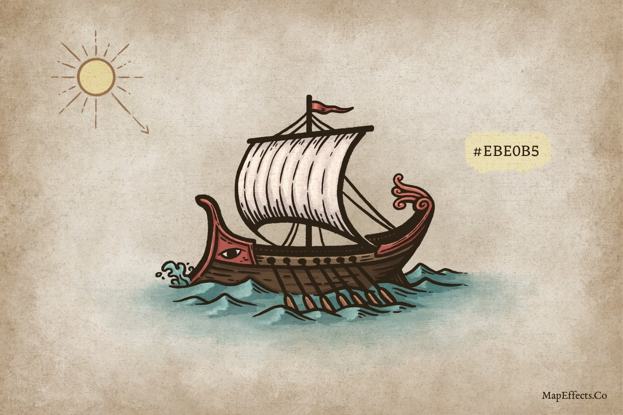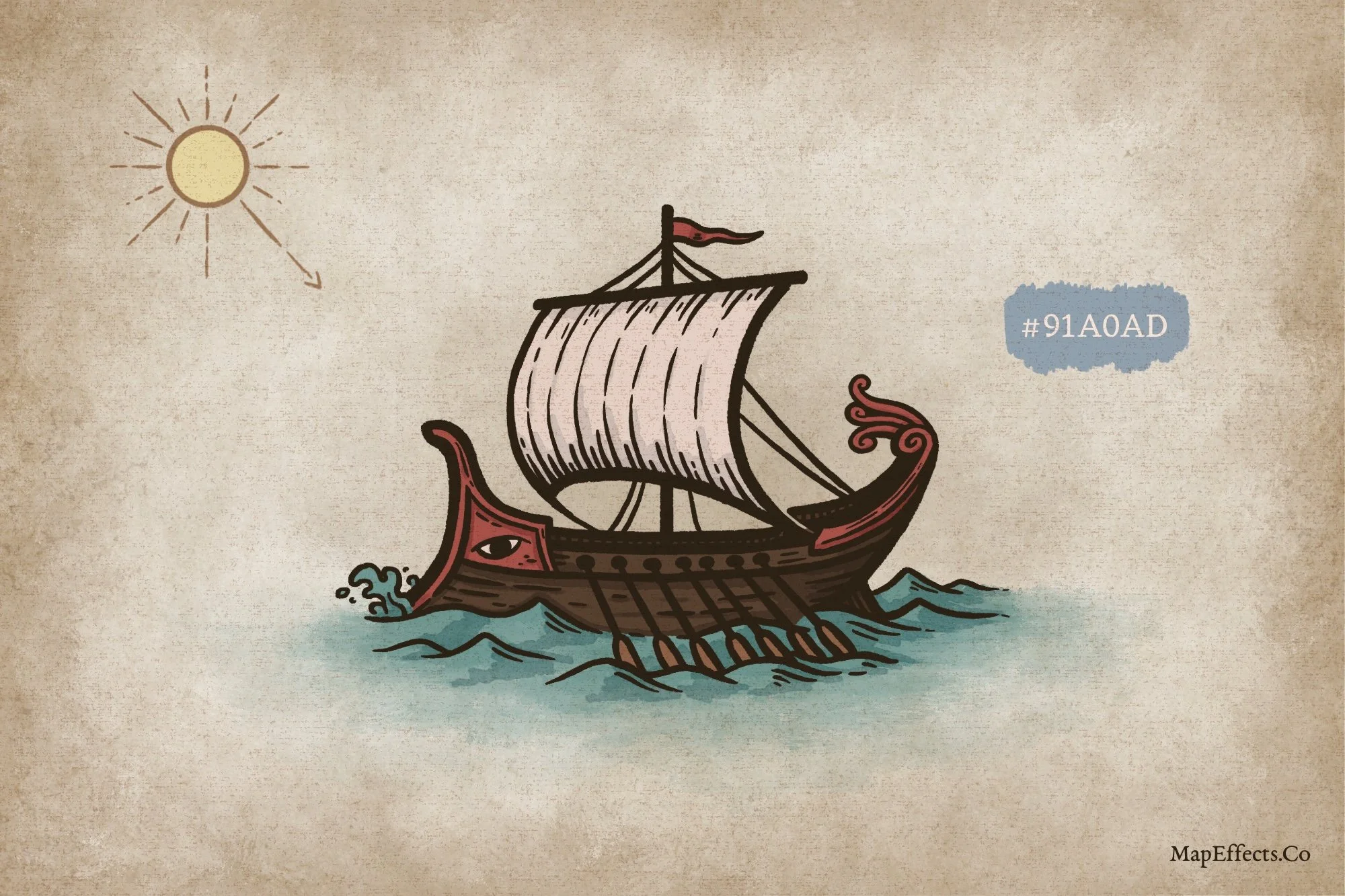 Create a new layer beneath your line art and block in the main colors of your ship. In Homer’s Odyssey, the hull of Odysseus’ vessel is repeatedly described as dark or black, since Greek ships were coated in tar or pitch to keep them waterproof. For this piece, I chose a deep brown instead, which fits the warmer palette of my map while still echoing that historic detail. I also added red accents along the prow and stern a color often used in Greek decoration to give ships a bold, distinctive character.
