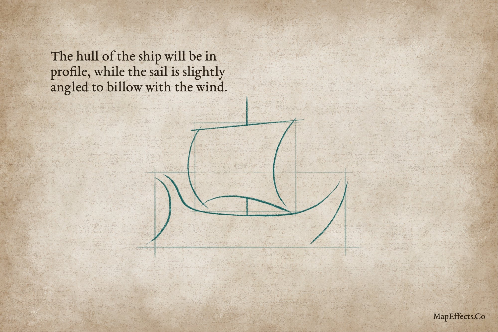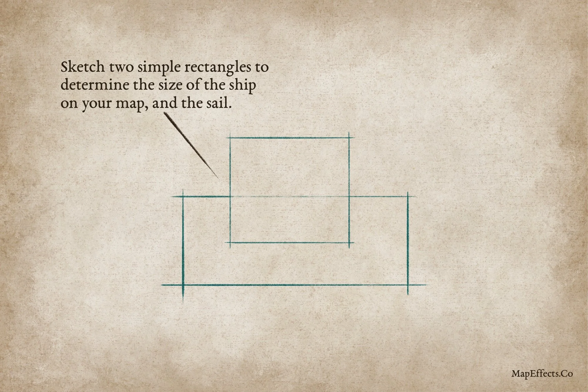 With our list in mind, we can begin by sketching a couple of simple rectangles, which mainly inform the overall size of the ship and mast.