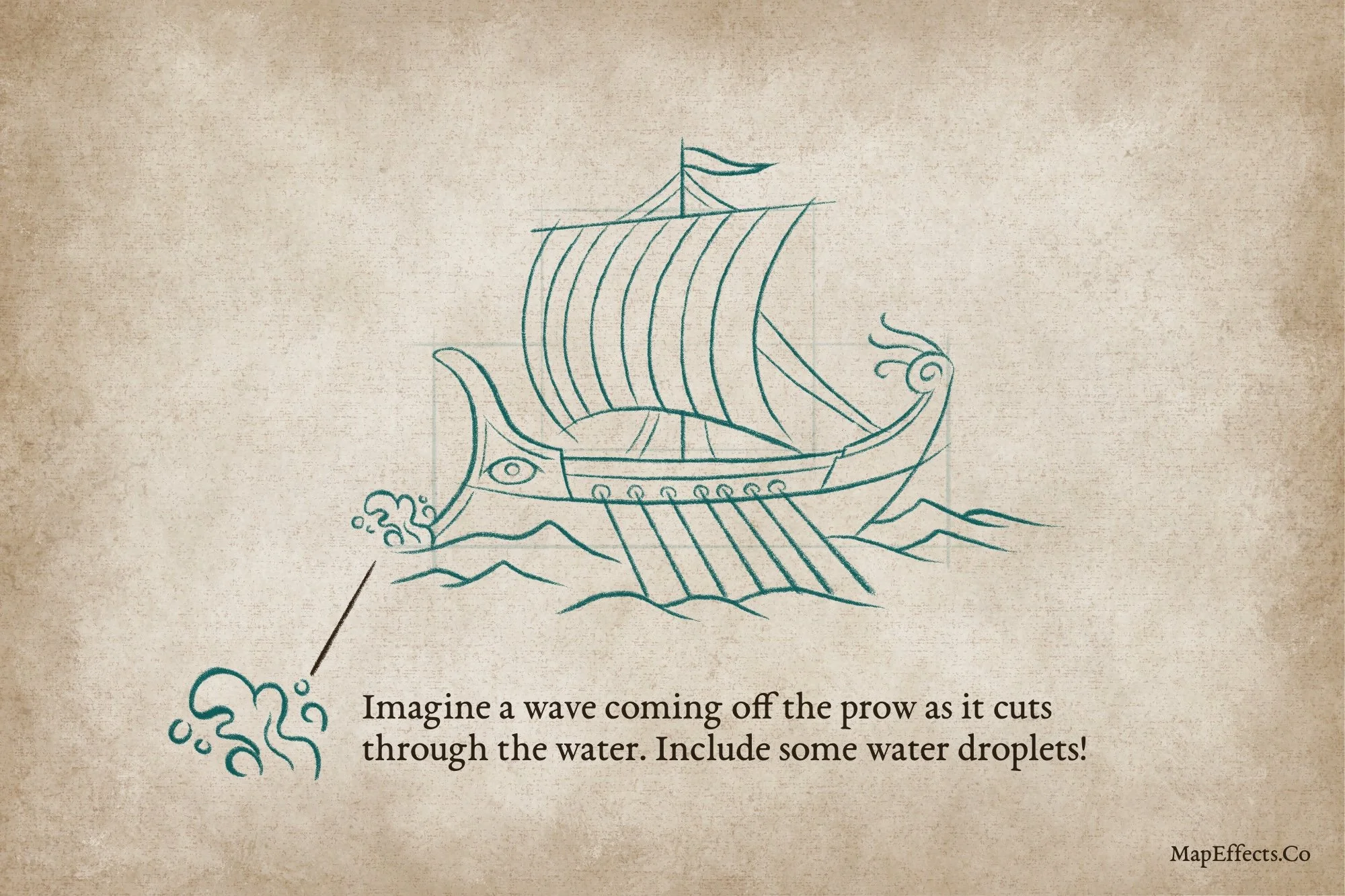 It’s now time to put our ship in the water. Draw a series of waves with either rounded tops, slightly pointed, or a combination of the two. You can then add some sea spray at the front to indicate the ship slicing through the water.
