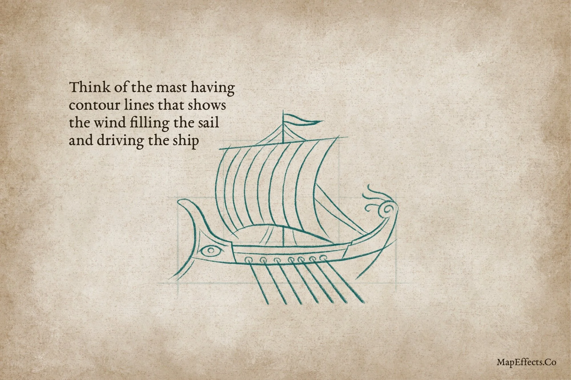 Add contour lines to the sail, and imagine it filling with the wind as it drives the ship through the water. You can also add some further detailing to the eye, railings, and rear of the ship.