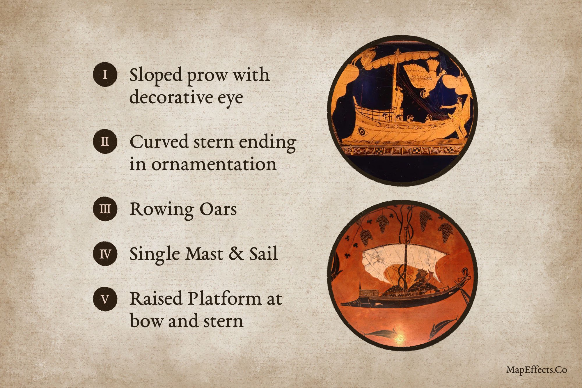 Before sketching your own ship, it helps to understand the signature elements that defined Greek vessels in ancient art. These features appear again and again on pottery and you can use it as a source of inspiration. It’s important to point out that the goal is not a precise scholarly illustration that is 100% historically accurate to a particular time period. Even some of the things listed above have exceptions in history (Like having more than one mast). What you are doing is compiling a mental list of shapes and aesthetics that all cause your final illustration to look “Greek” to a viewer.